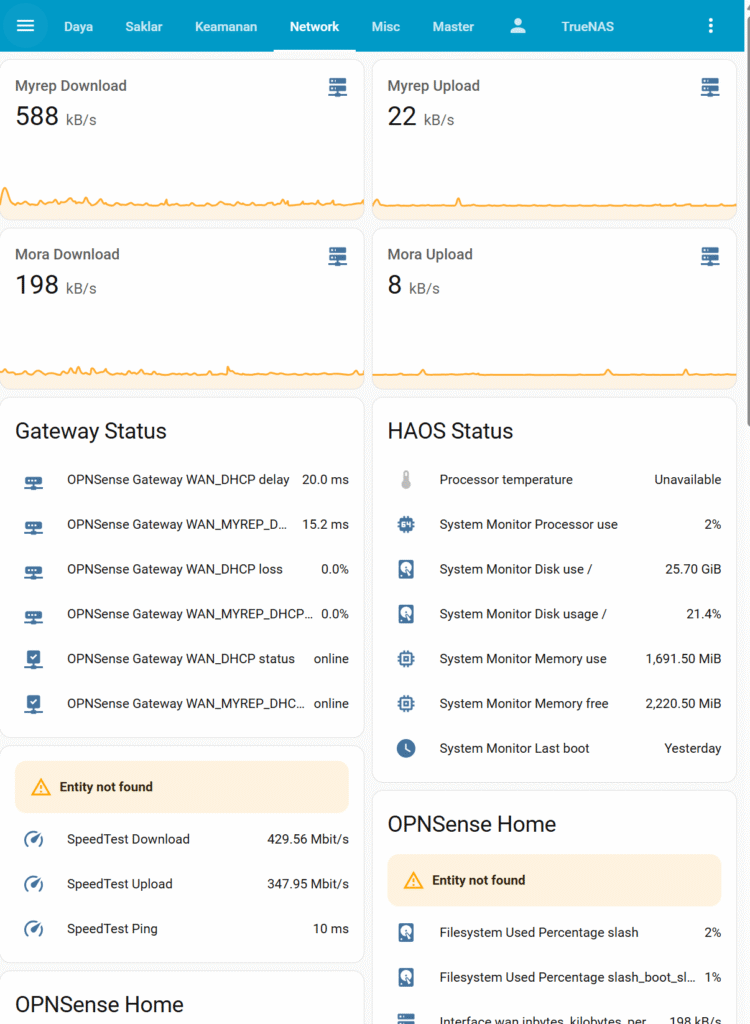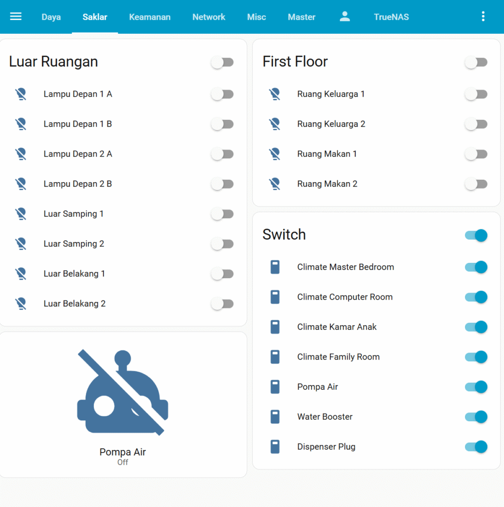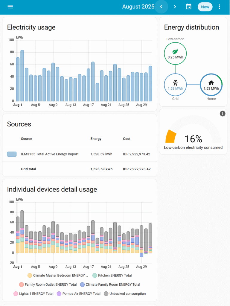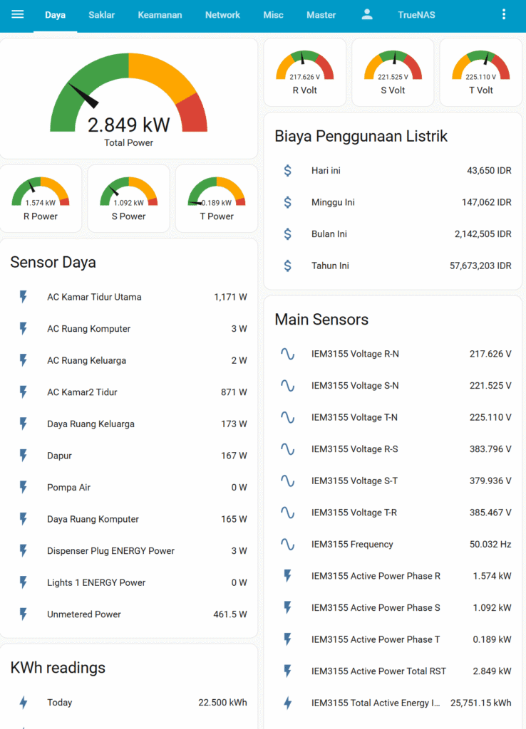 Setelah melakukan googling, ketemulah yang namanya home assistant. Di setup dan berhasil, dan malah akhirnya 1 rumah di monitor 🙂 Tidak hanya kelistrikan, aspek lain seperti CCTV, kondisi jaringan, dan lain-lain juga terintegrasi dalam 1 aplikasi ini.