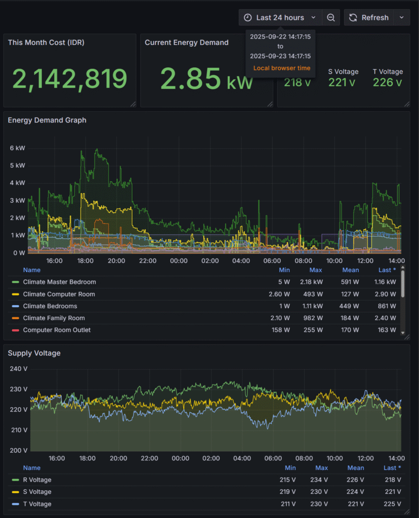 Lumayan berhasil, dan kemudian sudah menambah ke beberapa titik untuk di monitor. Namun ada satu yang masih belum ada, tidak ada grafik untuk melihat pemakaian listrik pada periode tertentu. Misal grafik voltase perlu apakah sepanjang hari voltasenya sesuai dengan standar PLN atau tidak.